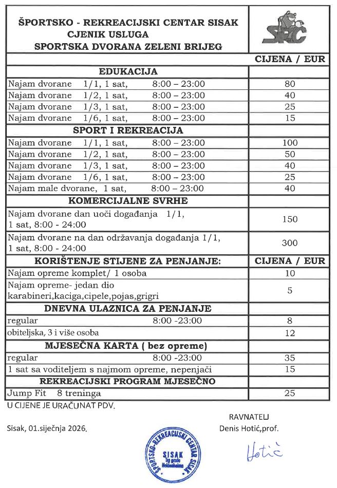 Sportska dvorana Zeleni brijeg – Cjenik usluga